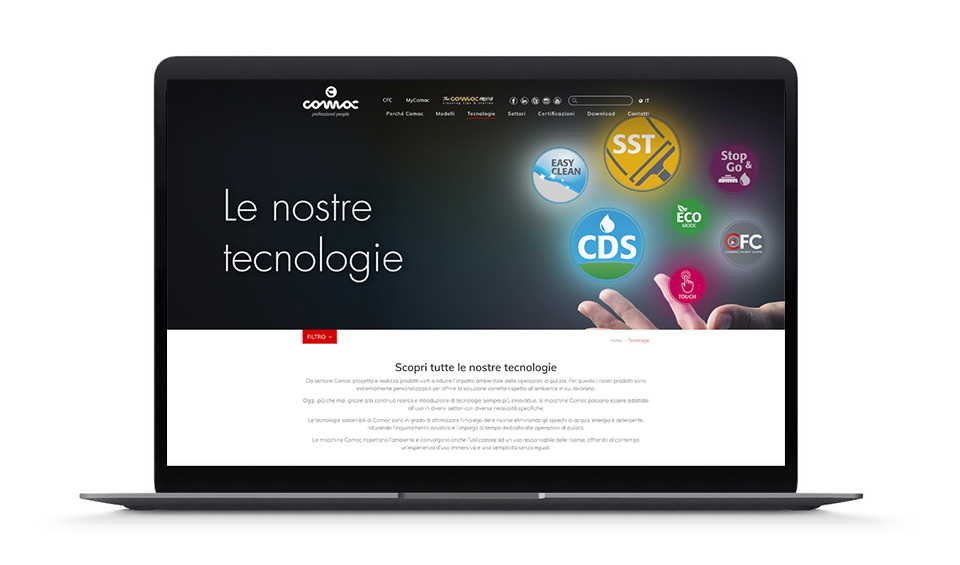 Siamo un’azienda che offre soluzioni per la pulizia professionale, quindi per noi è importante rendere le informazioni sui nostri prodotti e sulle nostre tecnologie facilmente accessibili, sia ai nostri clienti attuali sia ai potenziali. Puntiamo a fornire ai nostri utenti informazioni accurate e sempre aggiornate, e desideriamo anche condividere le nostre conoscenze e competenze nel campo della pulizia professionale. Per questo motivo l’obiettivo principale del sito di Comac è soddisfare le aspettative e le esigenze dei nostri visitatori nel modo più rapido e affidabile possibile. Nel mondo degli affari come nella vita, desideriamo dare valore; vogliamo essere utili e garantire massima usabilità su ogni fronte, compreso il web. Un esempio? La sezione che abbiamo dedicato alle nostre tecnologie, il luogo ideale dove scoprire le tecnologie che rendono le macchine per la pulizia di Comac innovative e adatte ad ogni sfida di pulizia.